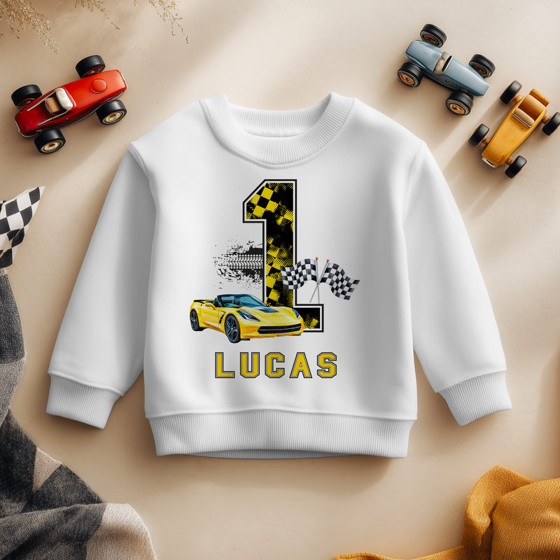 1st Birthday Super Yellow Race Car Boy Personalised Toddler & Kids Sweatshirt