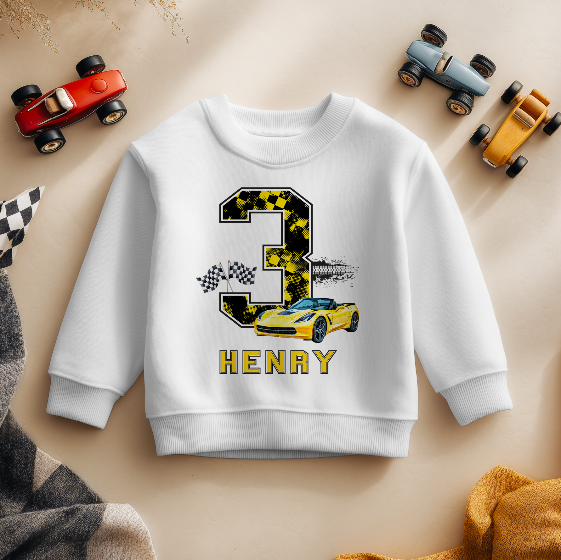 3rd Birthday Super Yellow Race Car Boy Personalised Kids Sweatshirt