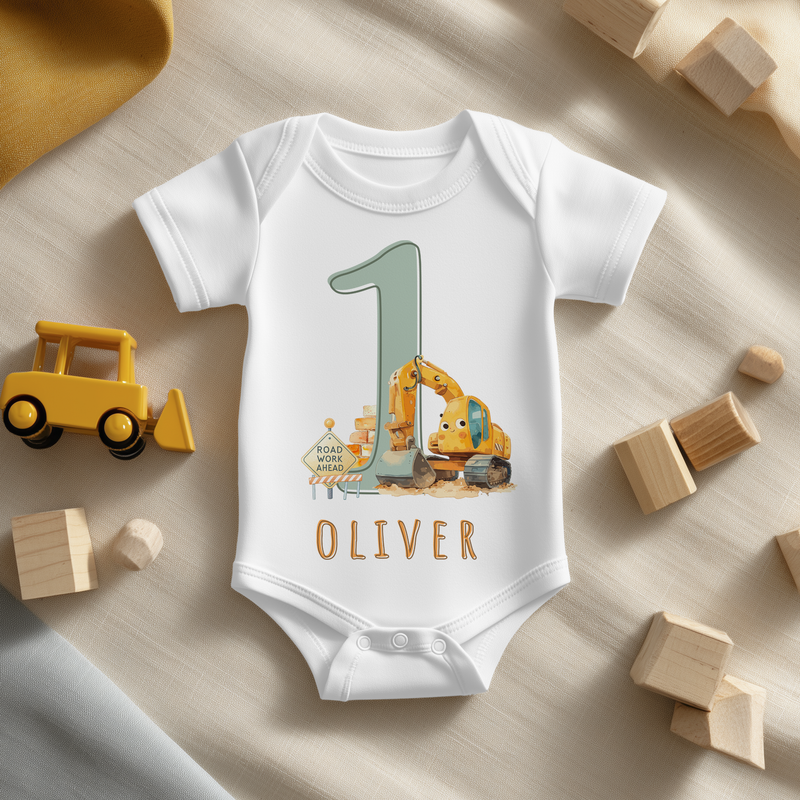 1st Birthday Construction Excavator Personalised Baby Bodysuit