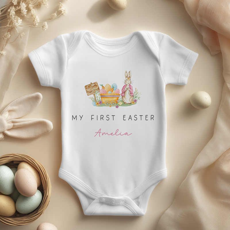 Personalised My First Easter Peter Rabbit Pink Egg Cart Baby Bodysuit for Girls