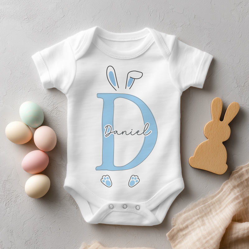 Personalised Easter Blue Initial Name Bunny Baby Bodysuit for Boys