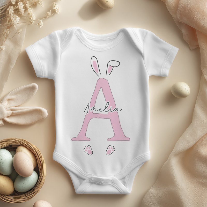 Personalised Baby Easter Pink Initial with Rabbit Print Baby Bodysuit for Girls