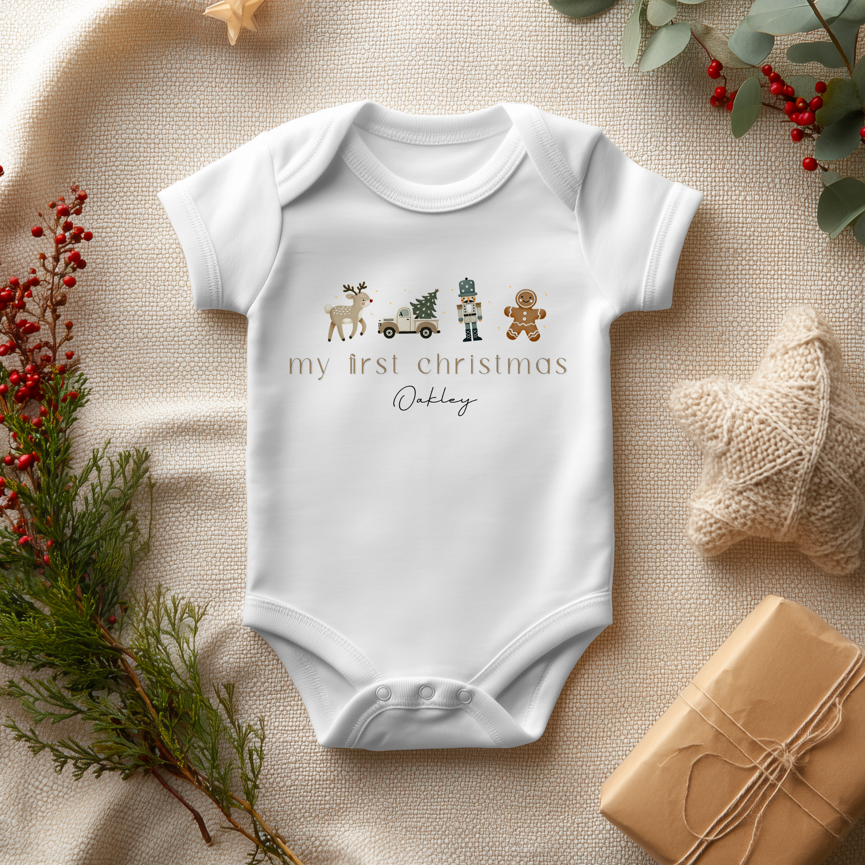 My First Christmas Cute Reindeer & Nutcracker Personalised Baby Bodysuit