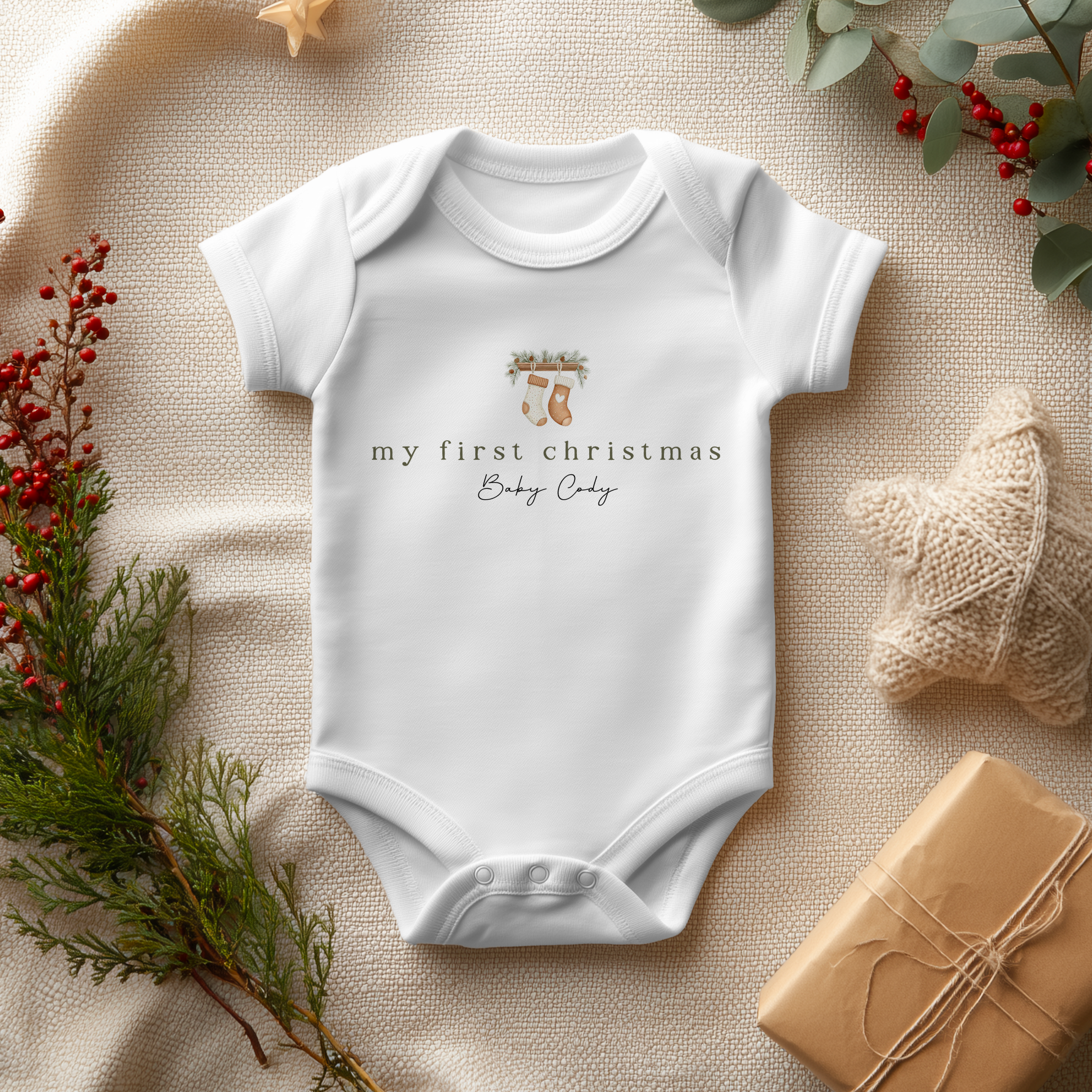 My First Christmas Minimal Neutral Personalised Name Baby Bodysuit