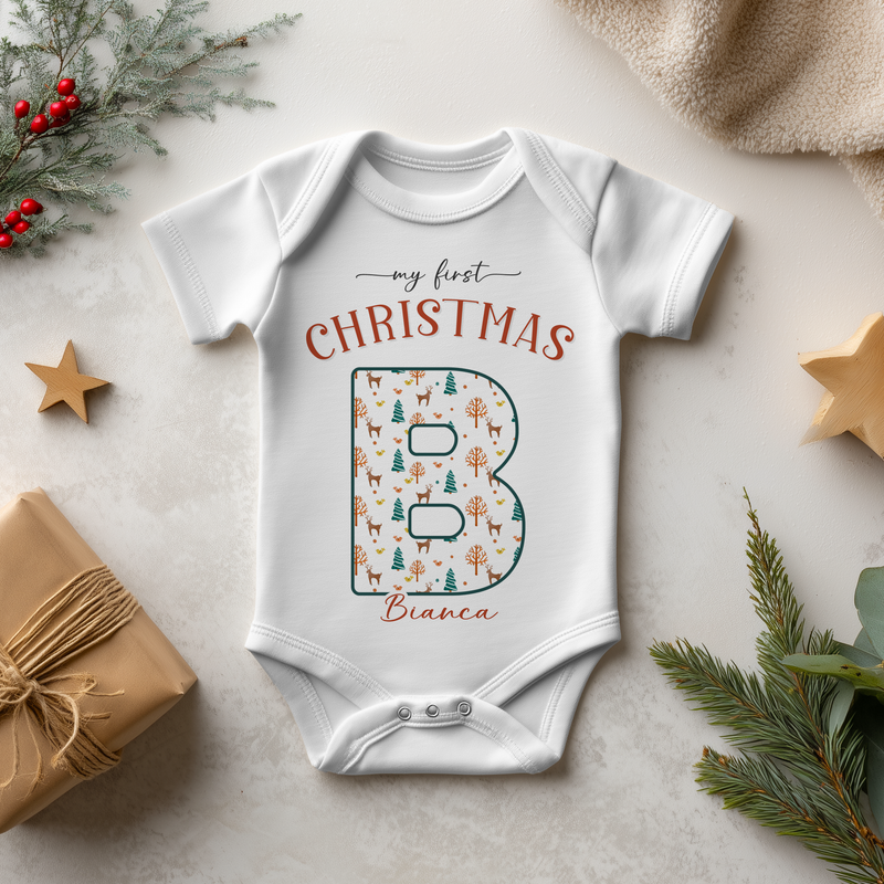 My First Christmas Reindeer Pattern Personalised Baby Bodysuit
