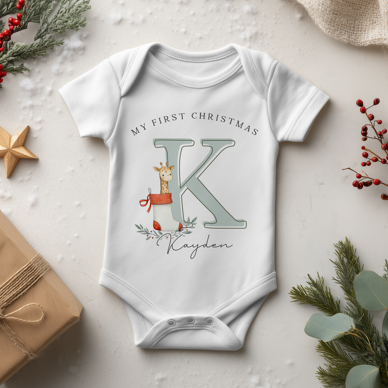 My First Christmas Giraffe Name With Initial Personalised Baby Bodysuit