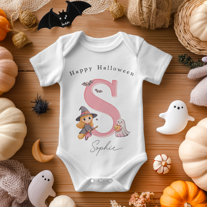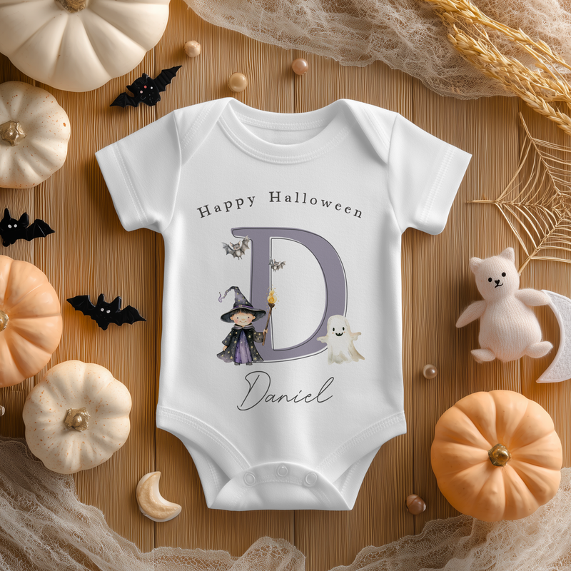 Halloween Name With Initial Cute Witch Personalised Baby Bodysuit