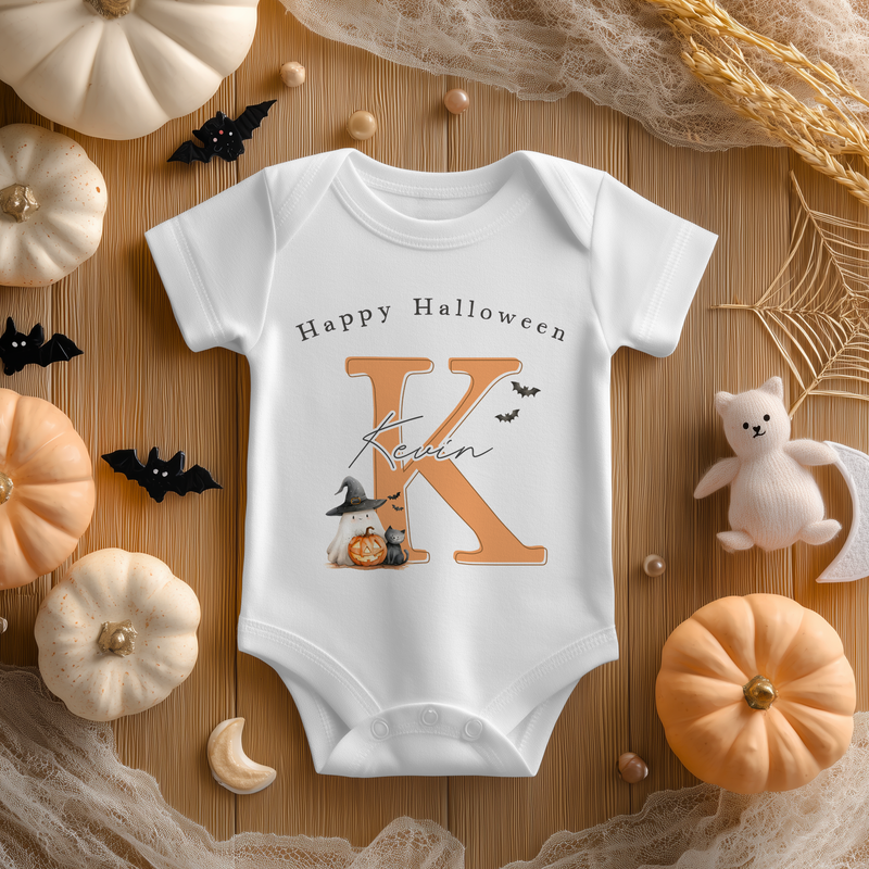 Halloween Name With Initial Pumpkin Ghost Personalised Baby Bodysuit