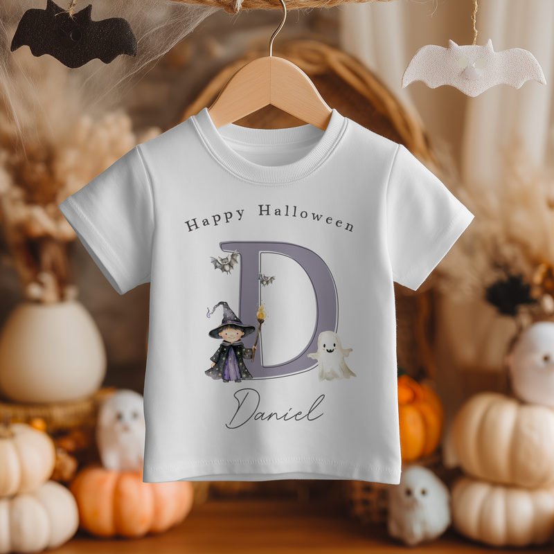 Halloween Name With Initial Cute Witch Personalised Toddler & Kids T Shirt