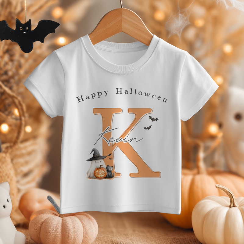Halloween Name With Initial Pumpkin Ghost Personalised Toddler & Kids T Shirt