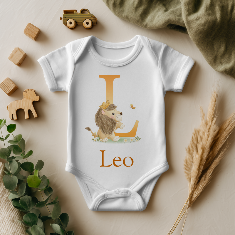 Personalised Name With Initial Lion Safari Baby Bodysuit