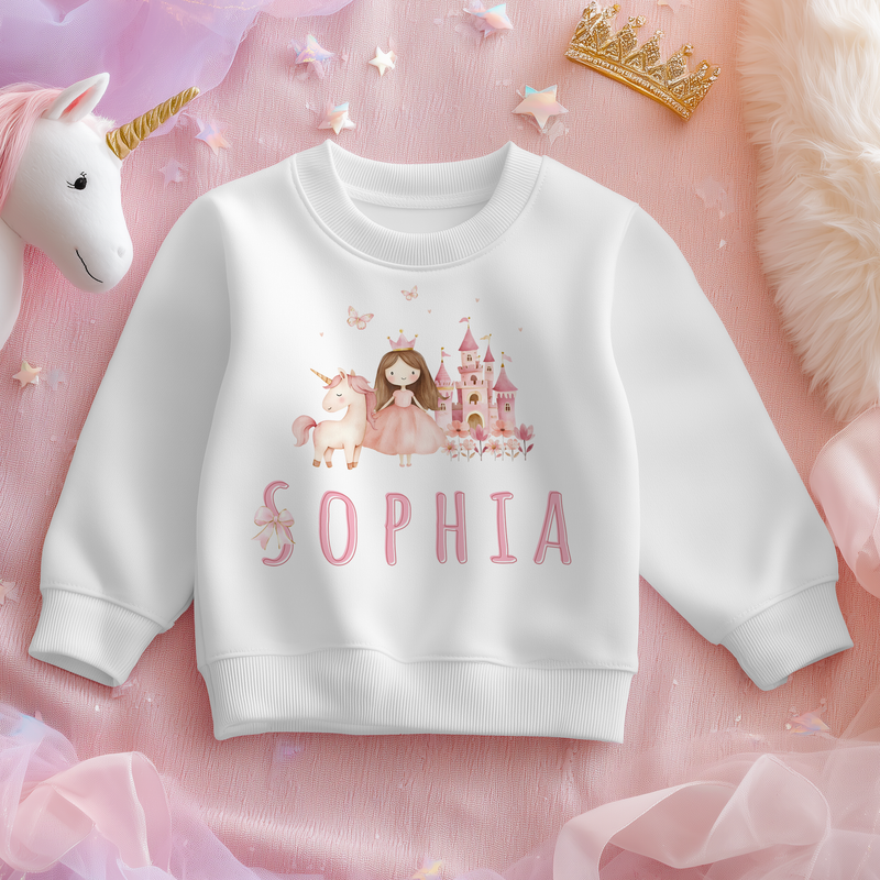 Princess With Unicorn Pink Castle Personalised Toddler & Kids Sweatshirt