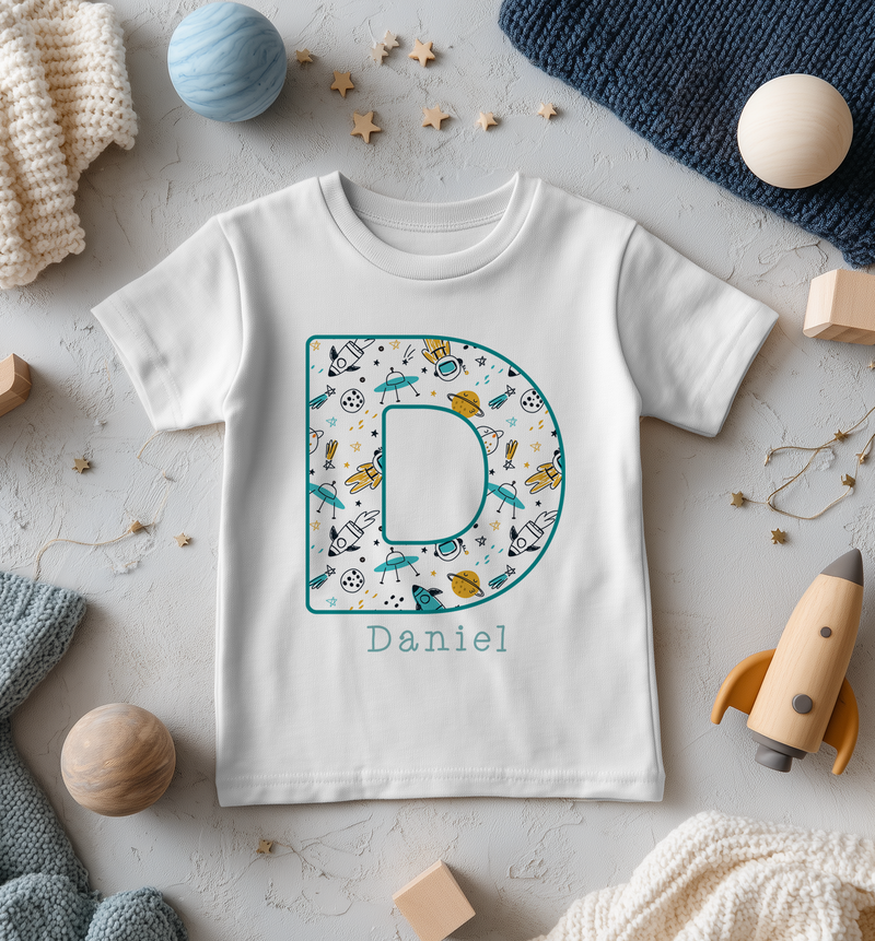 Personalised Name With Initial Space & Astronaut Theme Toddler & Kids T Shirt