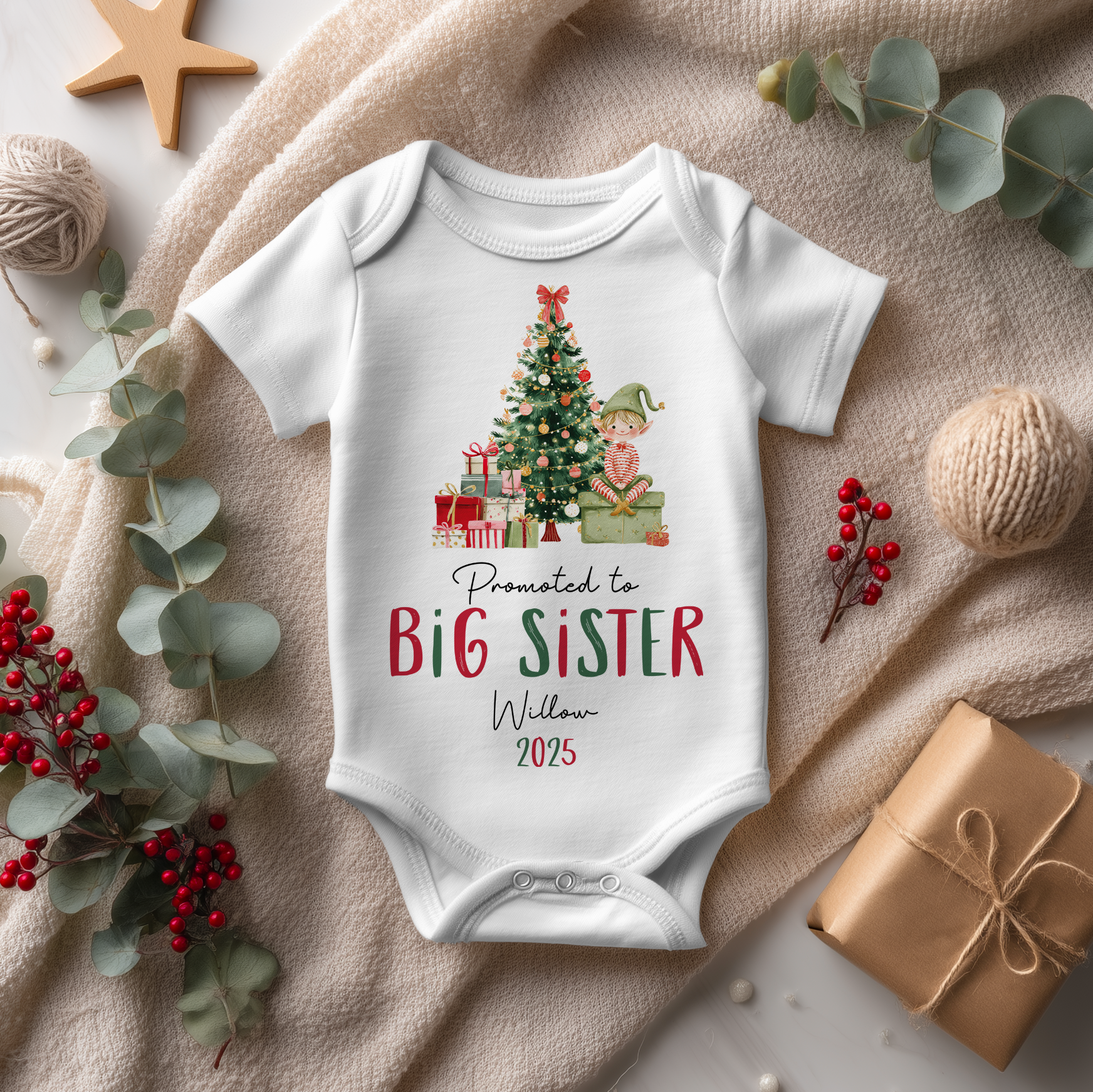 Promoted To Big Sister Christmas Elf Personalised Baby Bodysuit