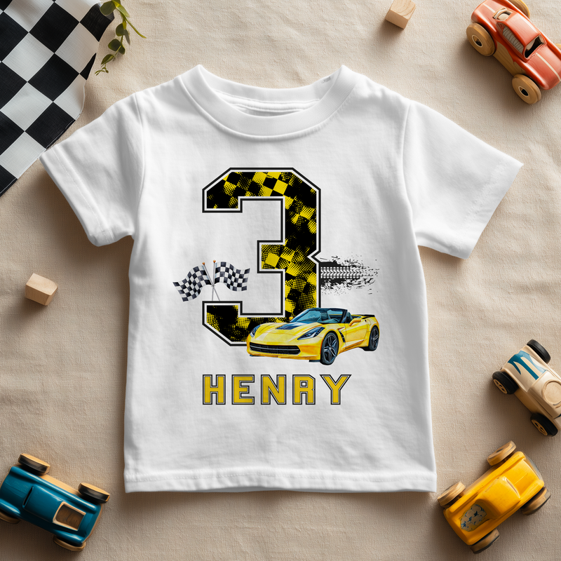 3rd Birthday Super Yellow Race Car Boy Personalised Kids T Shirt