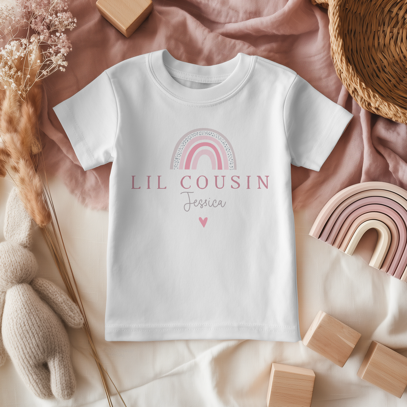Little/Lil Cousin Pink Boho Rainbow Personalised Toddler & Kids T Shirt