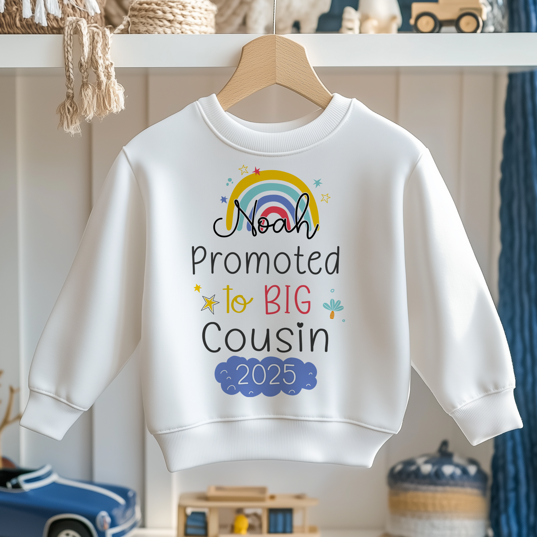 Promoted To Big Cousin Rainbow Clouds Theme Perosnalised Toddler & Kids Sweatshirt