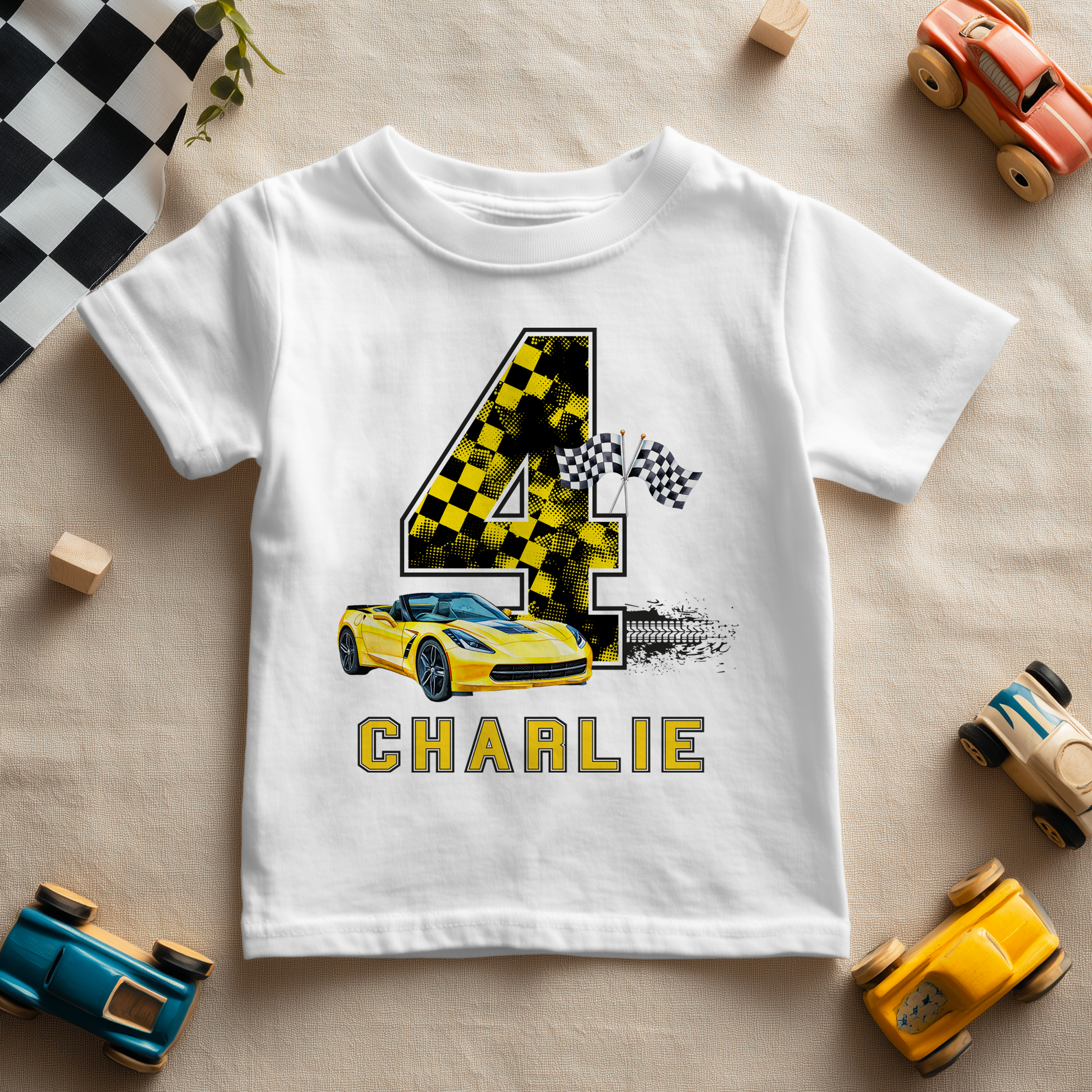 4th Birthday Super Yellow Race Car Boy Personalised Kids T Shirt