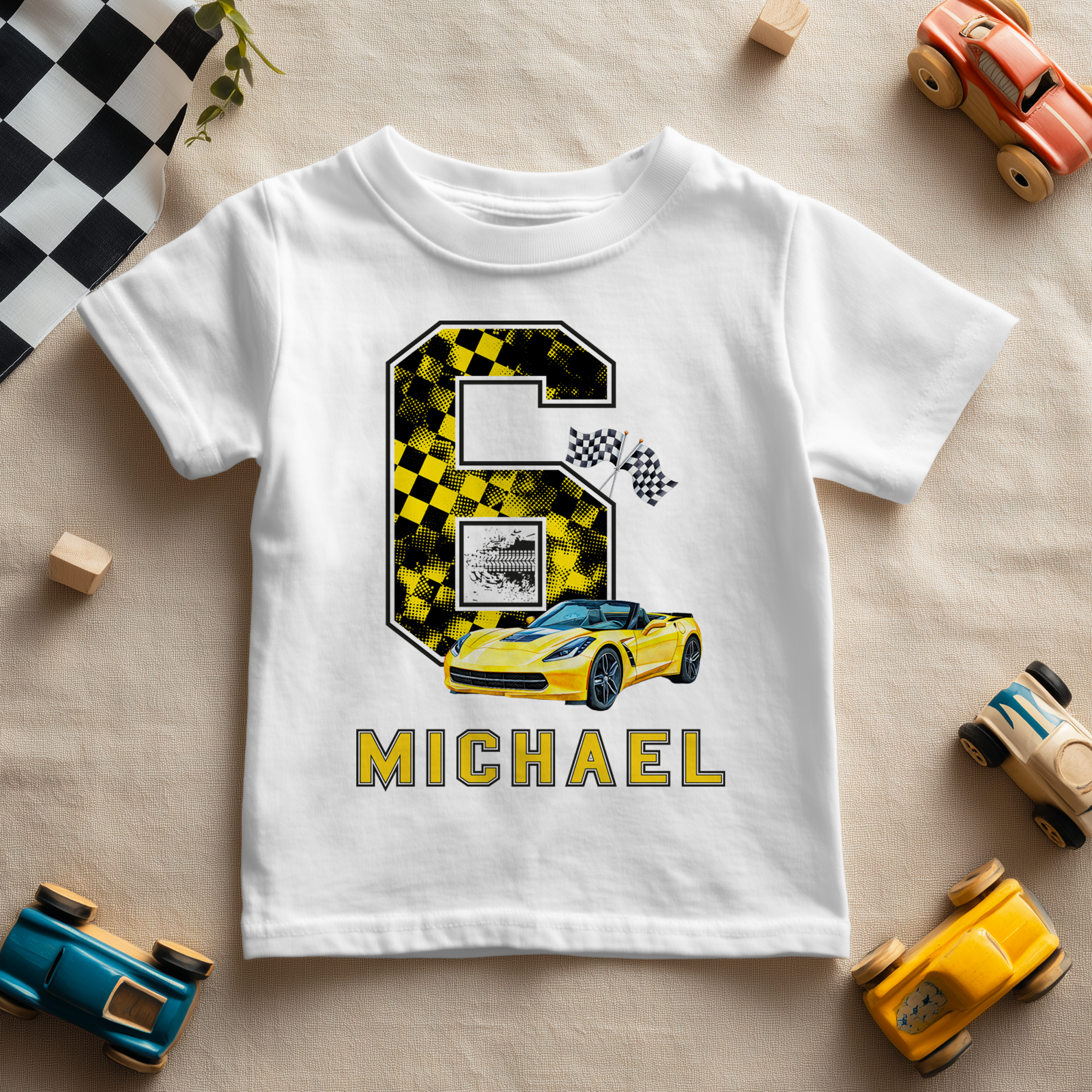 6th Birthday Super Yellow Race Car Boy Personalised Kids T Shirt