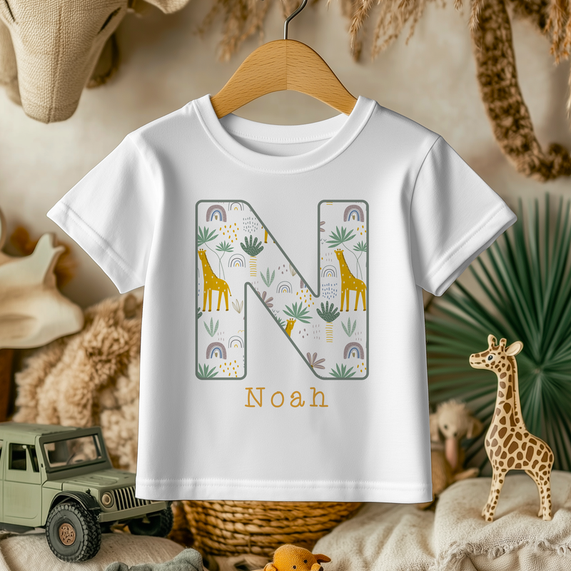 Giraffe Theme Personalised Name With Initial Toddler & Kids T Shirt