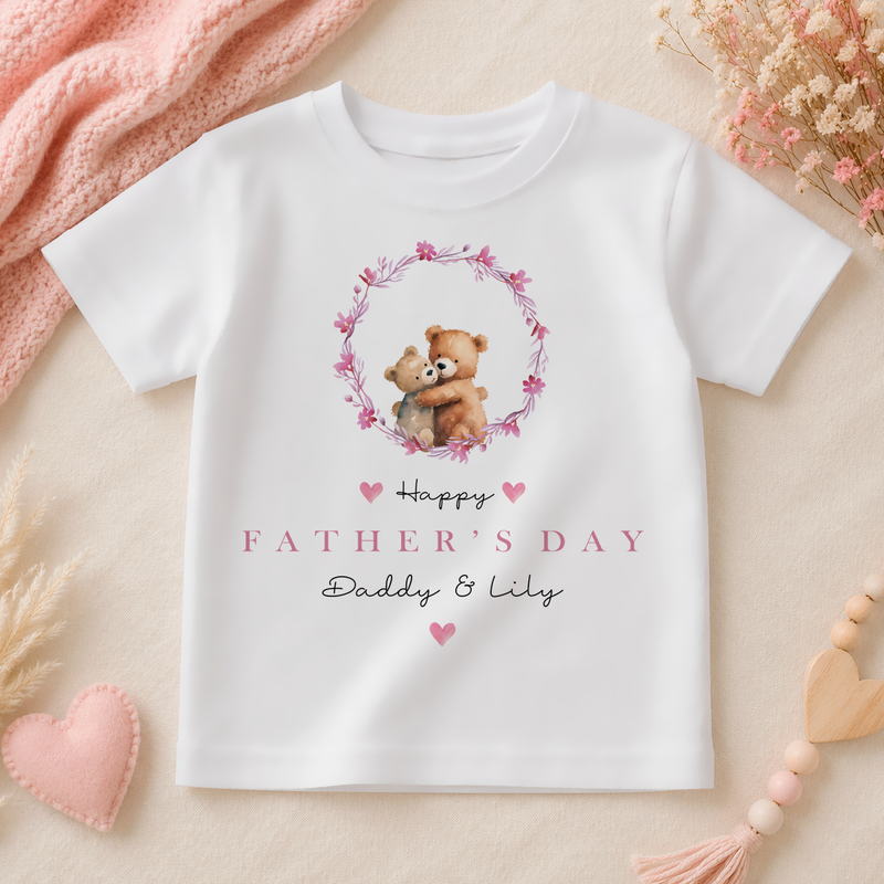 Personalised Father's Day Hugging Bear Pink Wreath T-Shirt for Girls & Kids