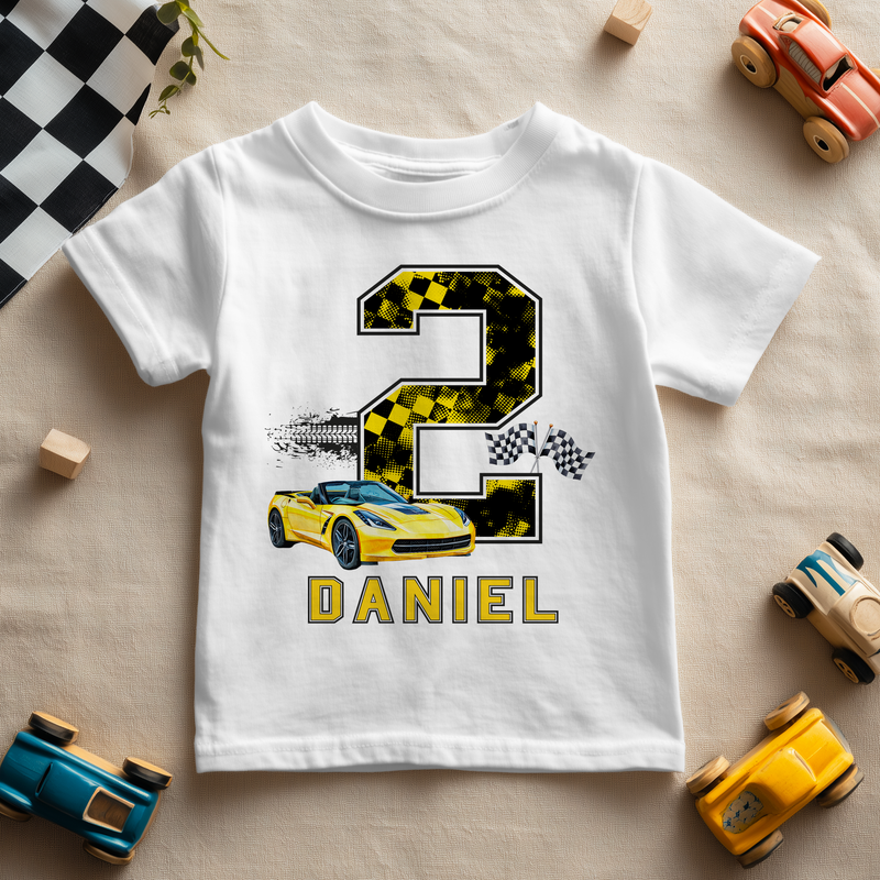 2nd Birthday Super Yellow Race Car Boy Personalised Toddler & Kids T Shirt