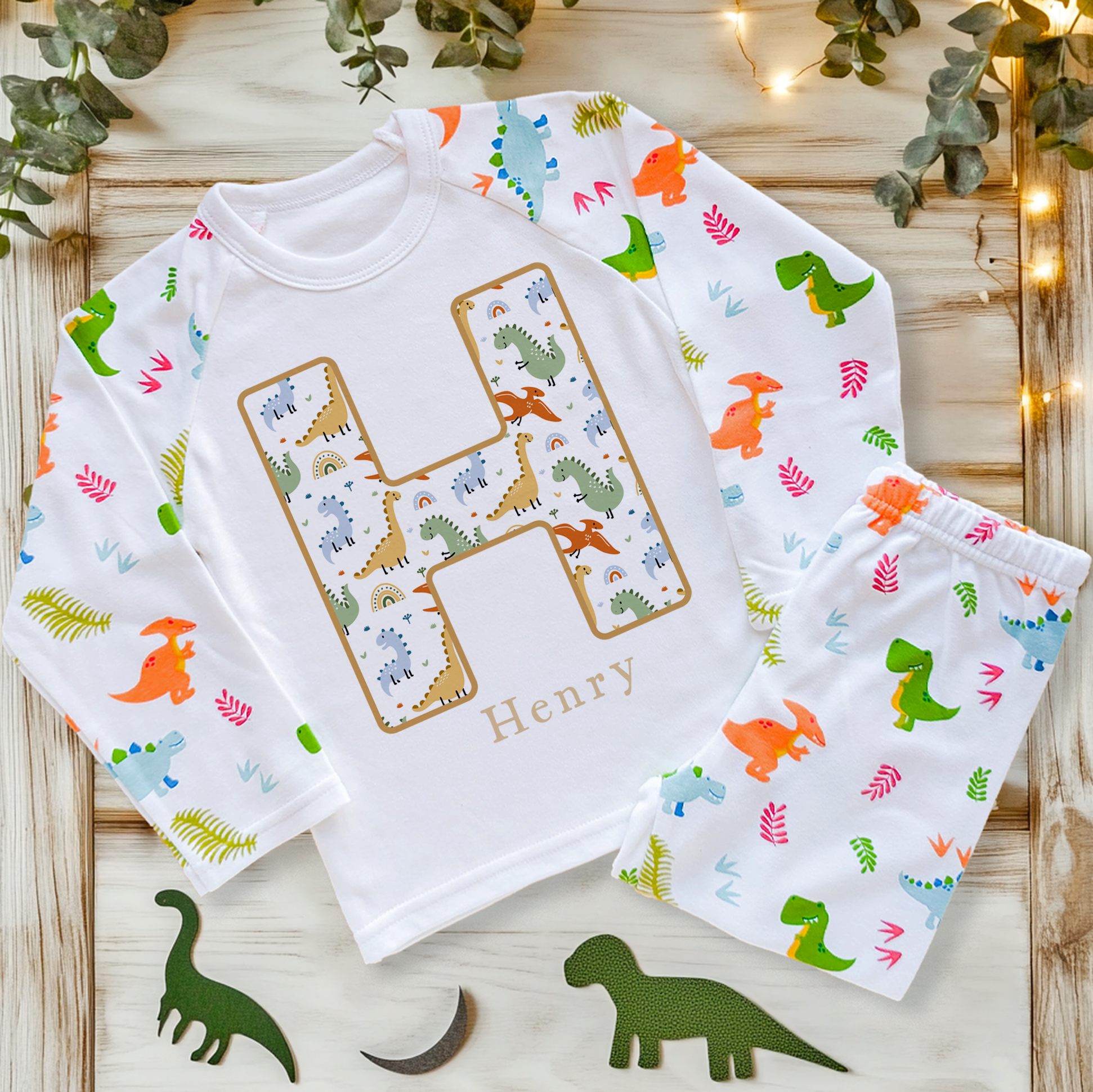 Dinosaur Theme Personalised Name With Initial Toddler & Kids Pyjamas Set