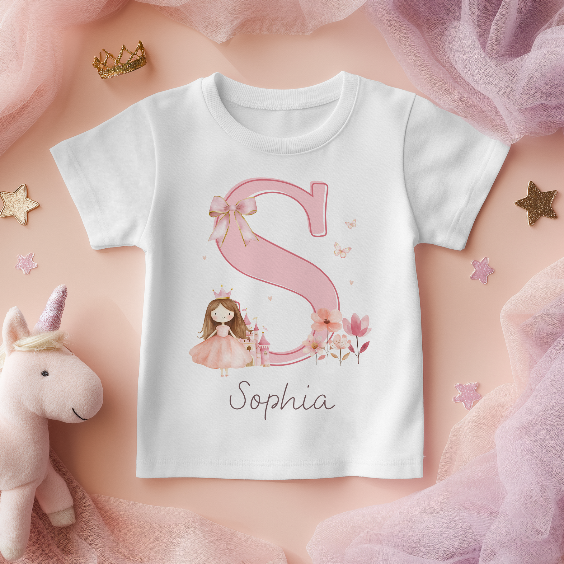Princess Pink Theme Personalised Name With Initial Toddler & Kids T Shirt